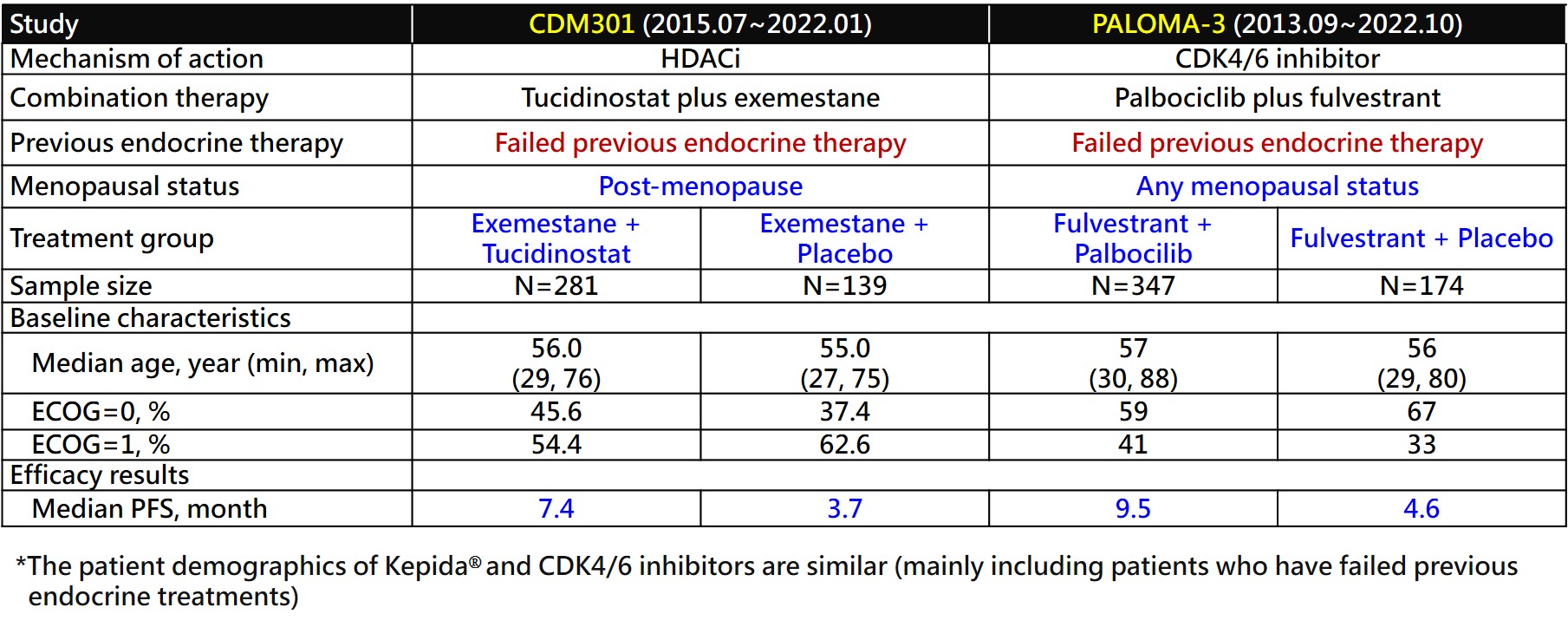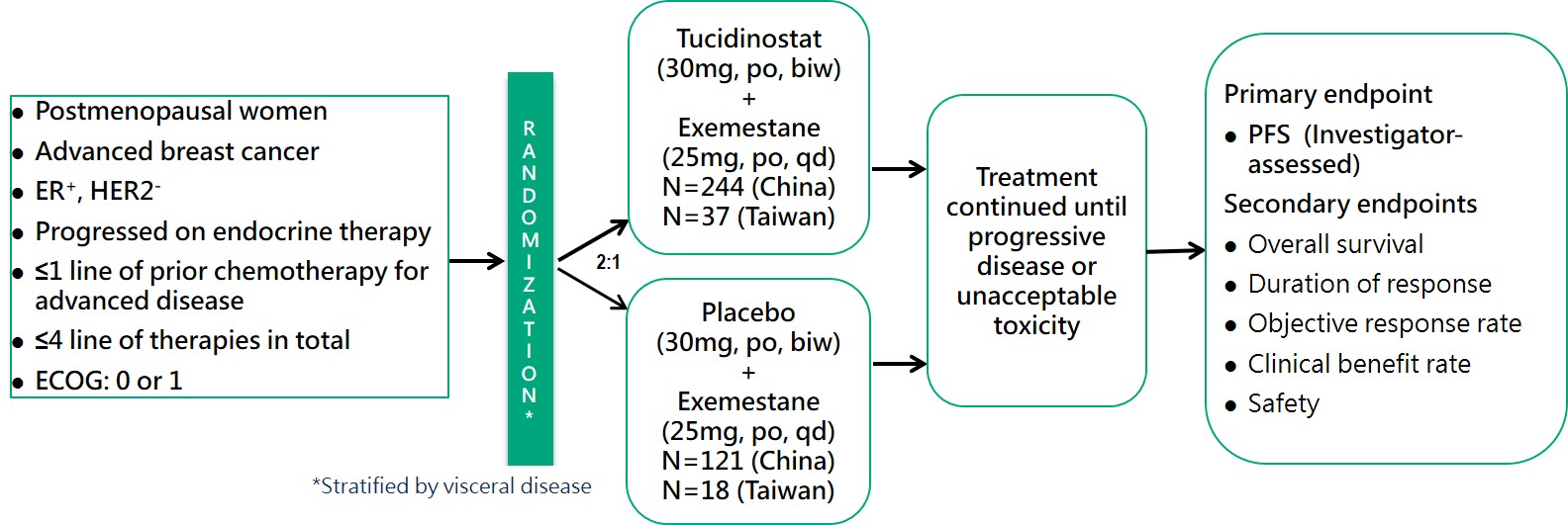 CDM301 is a well-designed, placebo-controlled, randomized, multicenter, pivotal Phase III clinical trial in Taiwan and China. A total of 420 patients were enrolled and randomized 2:1 to Tucidinostat plus Exemestane (experimental group) and placebo plus Exemestane (placebo group), with 281 and 139 patients, respectively. The efficacy outcomes mPFS of the primary endpoint of the trial were 7.4 months and 3.7 months (HR=0.716; 95% CI, 0.562 ~ 0.911; P=0.0066) for the experimental and placebo groups, respectively. Data analysis of 55 patients in Taiwan showed that Tucidinostat combined with Exemestane (experimental group) and placebo plus Exemestane (placebo group) were randomly assigned 2:1, with 37 and 18 cases, respectively. The mPFS of the primary endpoint were 8.6 months and 3.7 months (HR=0.516; 95% CI, 0.268 ~ 0.993; P=0.0477), for the experimental and placebo groups, respectively. In 420 patients, the objective response rate (ORR) of the secondary endpoint efficacy of the trial was 16.73% in the experimental group and 7.91% in the placebo group, which showed a statistically significant difference.