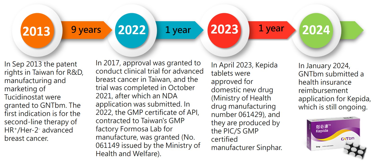 The trade name of Tucidinostat in Taiwan is Kepida®, a new generation oral epigenetic modulator. It is a subtype-selective HDAC inhibitor, and GNTbm spent 10 years and invested hundreds of millions in research and development to obtain the domestic certification for a new drug.