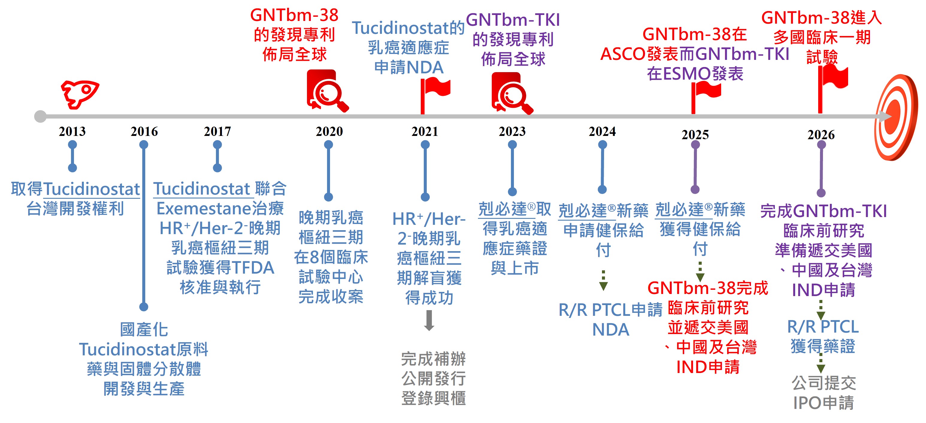 GNTbm-TKI預計於2026年底完成臨床前研究,申請美國、中國及台灣IND,進入多國臨床一期試驗。
